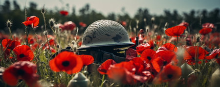 A military helmet in a field of red poppies. Remembrance day background, armistice day