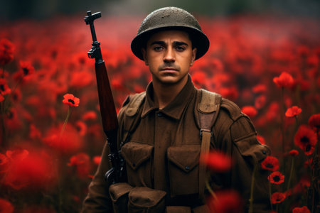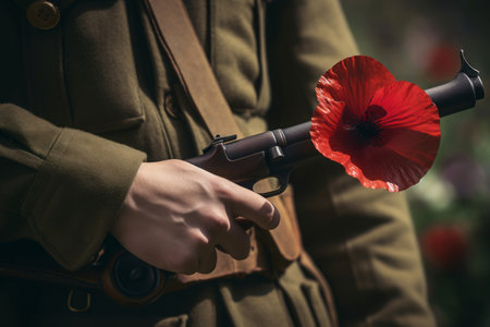 Soldier gun with poppy flower. Person holiday national patriot warrior. Generate Ai
