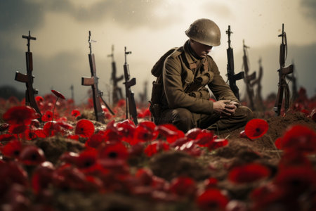A soldier sitting in a field of poppies remembering those who lost their lives for peace during war