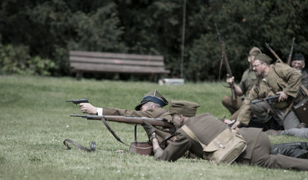 Details with the uniforms and weapons of World War I reenactors.