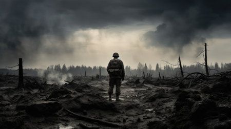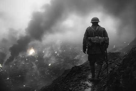 A lone soldier walks through a devastated landscape, surrounded by billowing smoke and the remnants of a city in ruin. Flames flicker in the background, highlighting the somber mood of the war-torn environment.