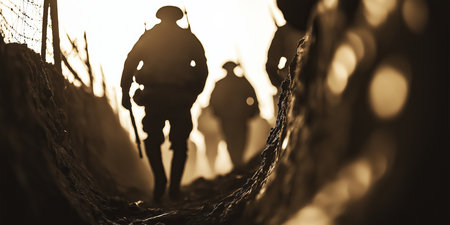 Silhouetted Soldiers Walking in Trench at Sunrise Depicting Military War Scene.