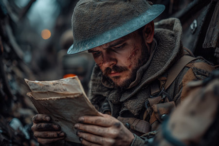 In a war trench, a soldier examines a letter with a focused expression, dirt on his uniform.