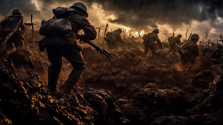 Group of Soldiers on the battlefield in war. Generative Ai
