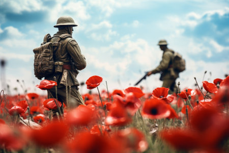 Poppy flowers on a field with soldiers