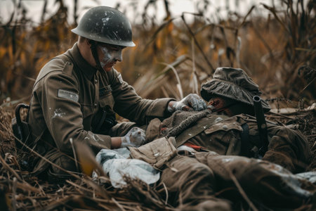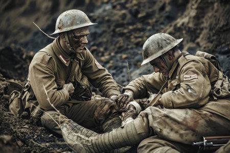 A soldier bandaging a wounded comrade on the battlefield, AI generated