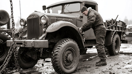A dedicated mechanic meticulously inspects and services a classic military truck, ensuring its operational readiness and preserving its historical integrity.