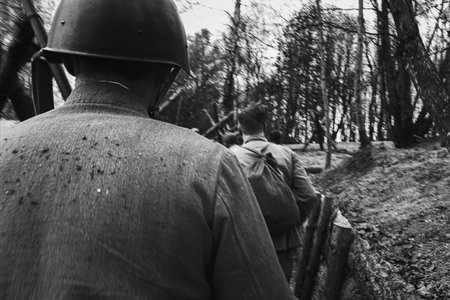 Gomel, Belarus - November 26, 2016: Soviet soldiers of the Red Army launched an attack on the checkpoint of the German army of the Wehrmacht