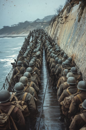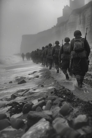 A group of soldiers in uniforms and helmets walks in a straight line along a wooden pathway beside the ocean. The cliffs rise steeply on one side, and waves crash against the shore under a cloudy sky, creating an intense atmosphere.
