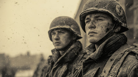 cropped shot of two men dressed in vintage military attire standing outside, created with generative ai