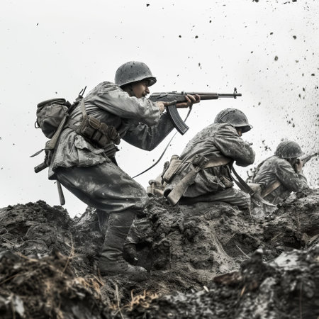 A soldier captured in a dramatic wartime moment displaying courage and intensity.