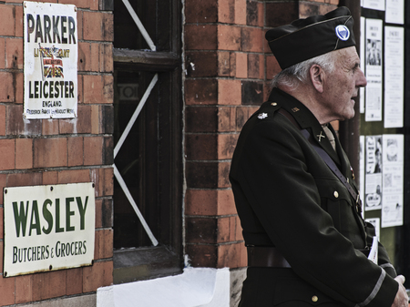 LEICESTERSHIRE,UK - JUNE 07 2015: elderly man in US Parachute regiment uniform standing on train station platform during Victory Day Europe Celebration Event at Great Central Railway, Quorn