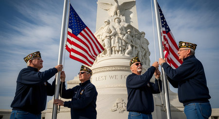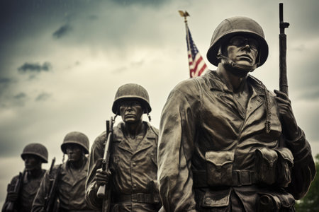 A group of soldiers in historical uniforms solemnly raise the American flag on a gloomy day.. AI Generation
