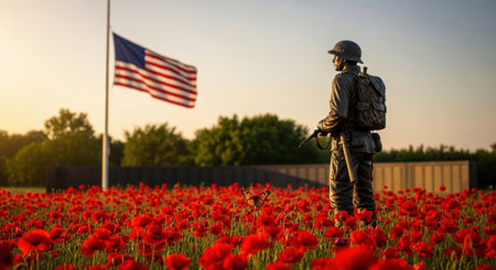 A solemn war memorial featuring a soldier statue standing in a field of vibrant red poppies with an american flag at half mast under a golden hour sky, symbolizing remembrance and sacrifice.
