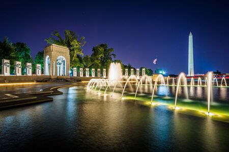 Fountains at the National World War II Memorial and the Washington Monument at night, at the National Mall, in Washington, DC.