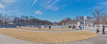 WASHINGTON DC, USA - APRIL 27 2019 - Many tourist at World War II Memorial monument and fountain