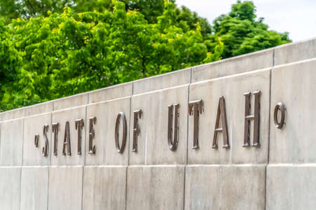 State Of Utah sign mounted on a wall against vibrant green tree leaves and sky. Views at the Utah State Capitol Building in Salt Lake City on a sunny day.