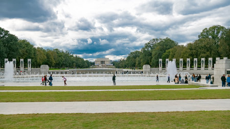 World War 2 memorial in Washington, DC. Walking tourists.