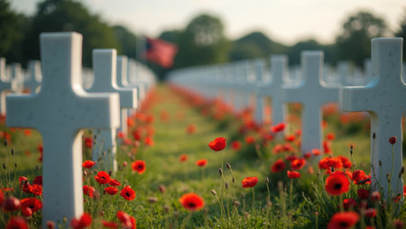 A solemn view of soldiers' graves marked with crosses, standing in a field of poppies, symbolizing Remembrance Day.
