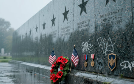 Soldier Placing Flag on Memorial Wall, Honoring Fallen Heroes