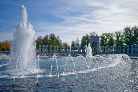 Washington, D.C., USA - November 11, 2017: Jets of water spurting from the World War II Memorial's fountain, located on the National Mall.