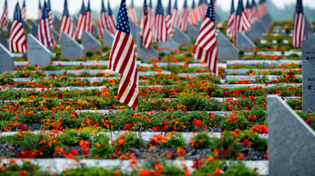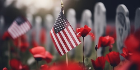 A serene landscape featuring American flags and bright red poppies, symbolizing patriotism and remembrance in a tranquil environment. A tribute to freedom.