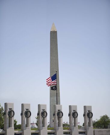 The Washington Monument behind patriotic flags