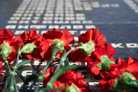 Russian language phrase sergeant,major, colonel,lieutenant, ranker - army ranks, flowers on the memorial to fallen soldiers, red carnations on black marble