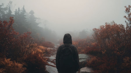 Person hiking path into foggy autumn wilderness