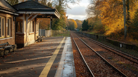 Outdoor railway platform with no people, surrounded by autumn leaves and soft golden light, a peaceful rural setting