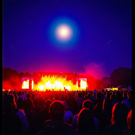 Stage lights and crowd of audience with hands raised at a music festival. Fans enjoying the party vibes.