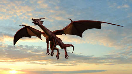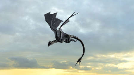 terrifying powerful dragon, Handmade mystical creature with strong wings, reptile with spikes and long tail, evil serpent with devilish look attacks enemy, magical animal flies over lake at sunset
