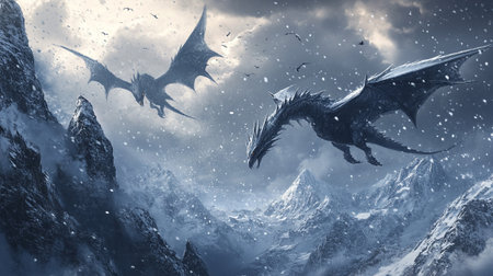 Majestic black dragon soars over misty mountains under gray sky with snow capped peaks