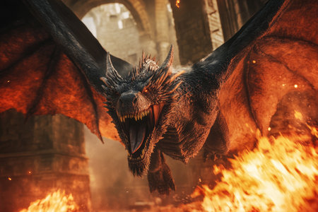 A massive dragon with sharp teeth roars inside a fiery ancient castle room in cinematic detail