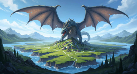 Fantasy landscape with dragon and mountains. 3d illustration.