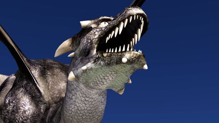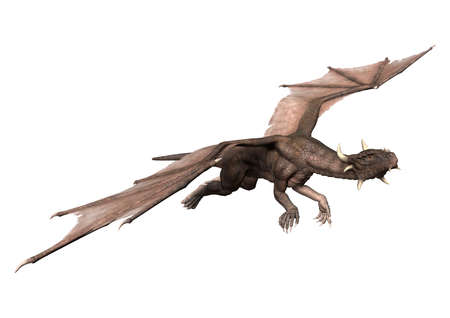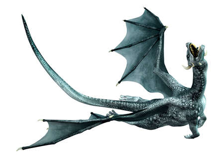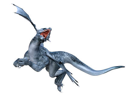 Wyvern or Dragon fantasy creature standing up with wings spread and mouth open, 3D illustration isolated on white.