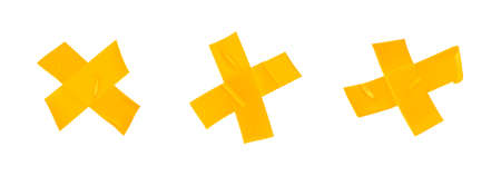 Yellow duct tape cross set. Realistic yellow adhesive tape cross for fixing isolated on white background. Adhesive cross. Realistic 3d vector illustration.