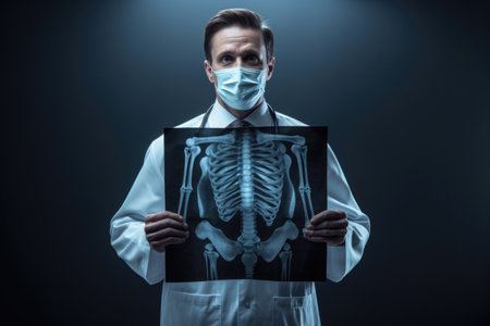 A doctor in a medical mask holds an x-ray of a person in his hands on a dark background