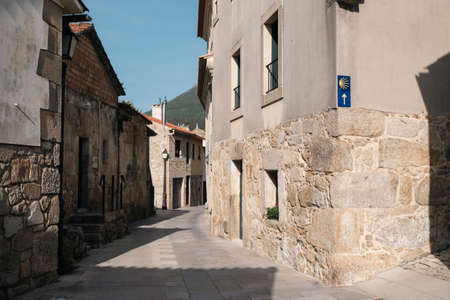 Signs of the way of Santiago on the wall. A street of Oia, Galicia, Spain.