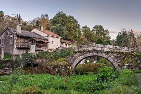 Old Roman stone bridge crossing a river in Galicia, Spain