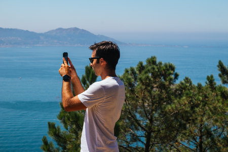 A young Spanish Caucasian man taking a photo of the beautiful view, with his phone