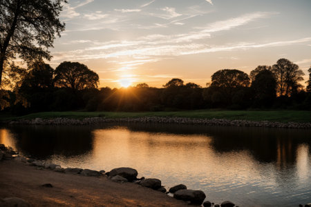 Golden Hour at the Riverbank: Serene Sunset Reflections on Calm Waters