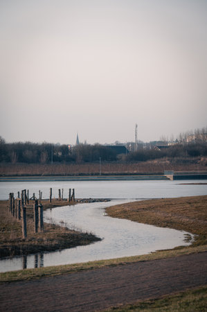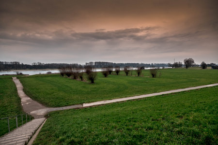 Panoramic view of the landscape at Dormagen - Zons on the Rhine river in Germany.