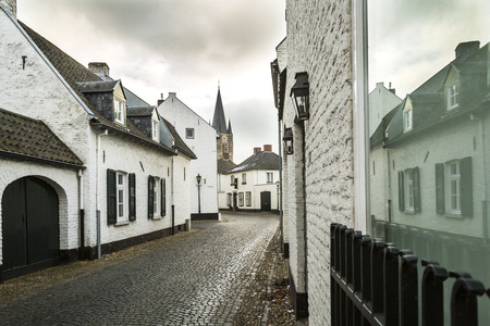 Street with church on the background in the historic city of Thorn in Limburg, the Netherlands. Known for its white houses.