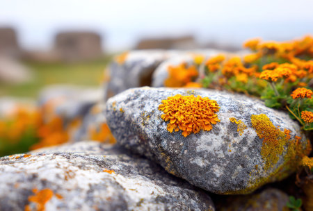 Close-up of a weathered stone wall adorned with vibrant orange lichen and small flowers