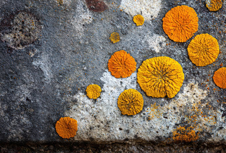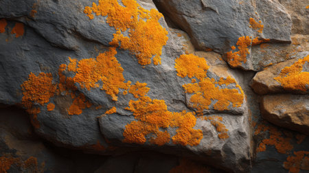 Discover the stunning contrast of vibrant orange lichen flourishing on a rugged gray stone surface, highlighting the intricate beauty of nature's microbial life and textures.