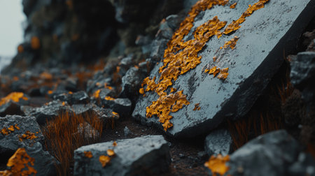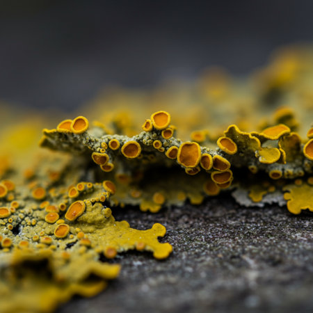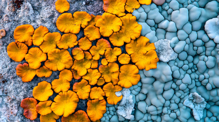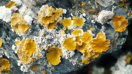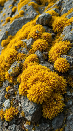 Vibrant yellow lichen growing on rocks, showcasing intricate patterns and textures in nature's ecosystem, highlighting biodiversity.