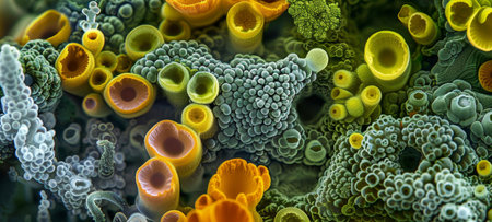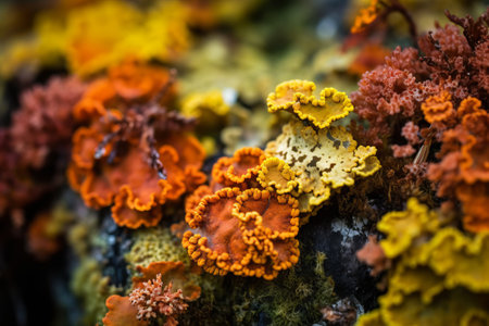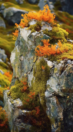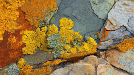 Discover the intricate beauty of vibrant lichen patterns flourishing on a rocky surface, showcasing nature's colorful artistry in yellow, green, and orange tones.