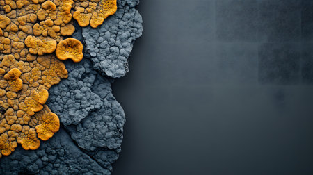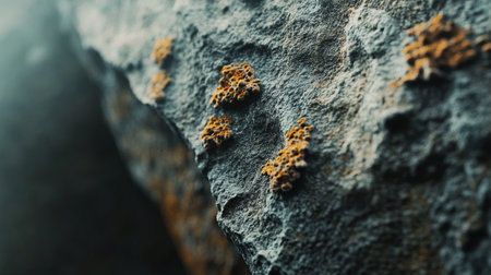 This abstract macro photograph showcases the intricate textures and patterns of lichen growing on a rough rock surface.