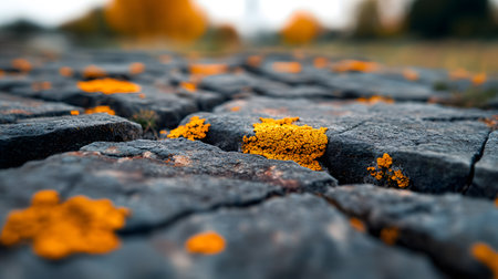 Vibrant orange moss covers textured stone pathway in urban setting during daylight hours